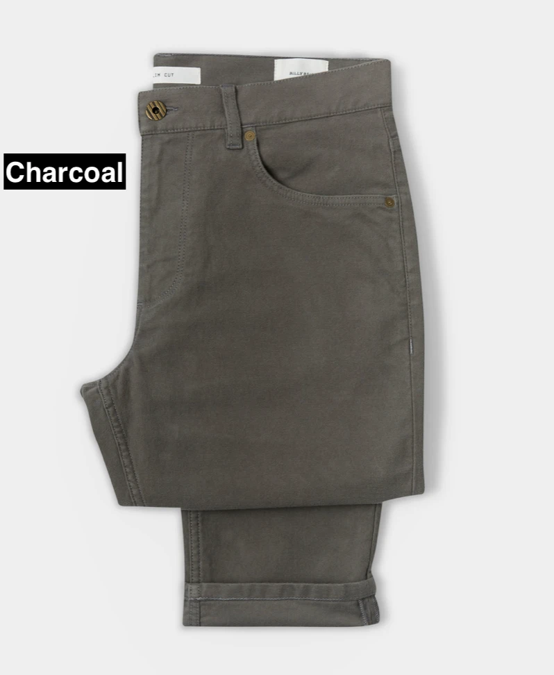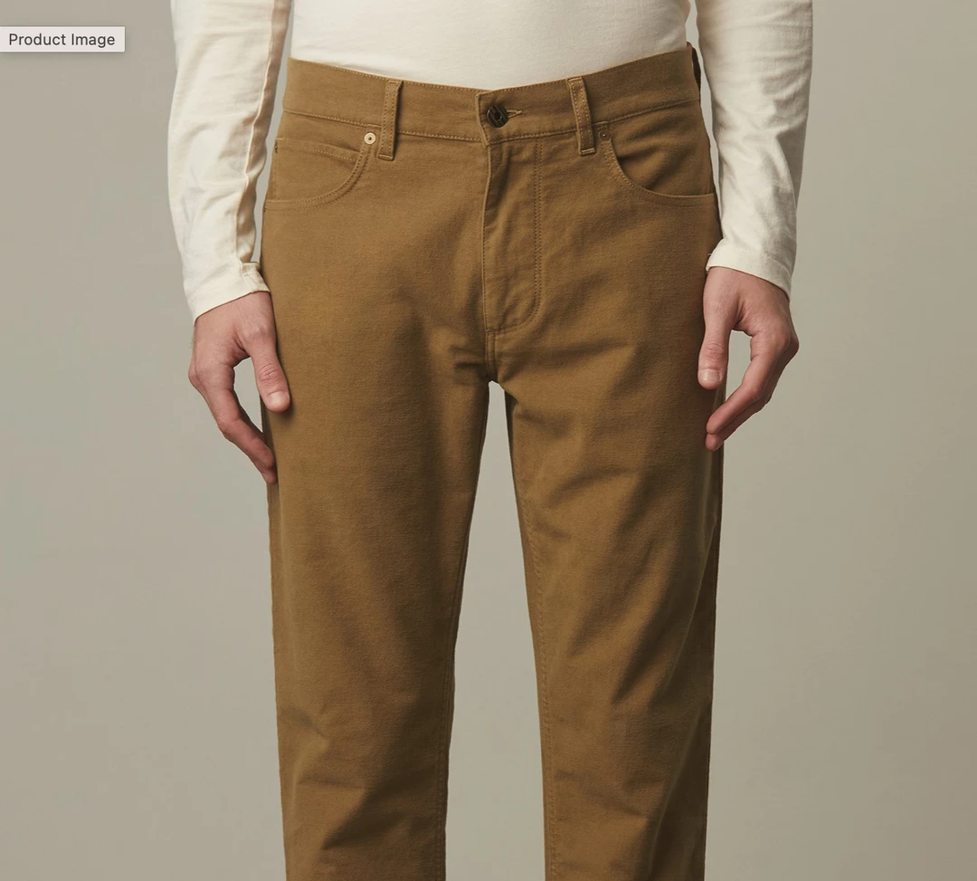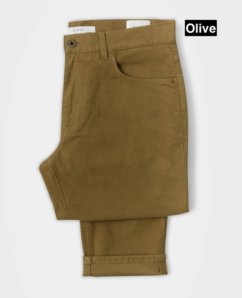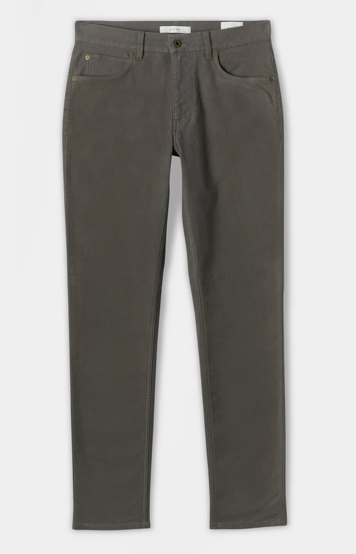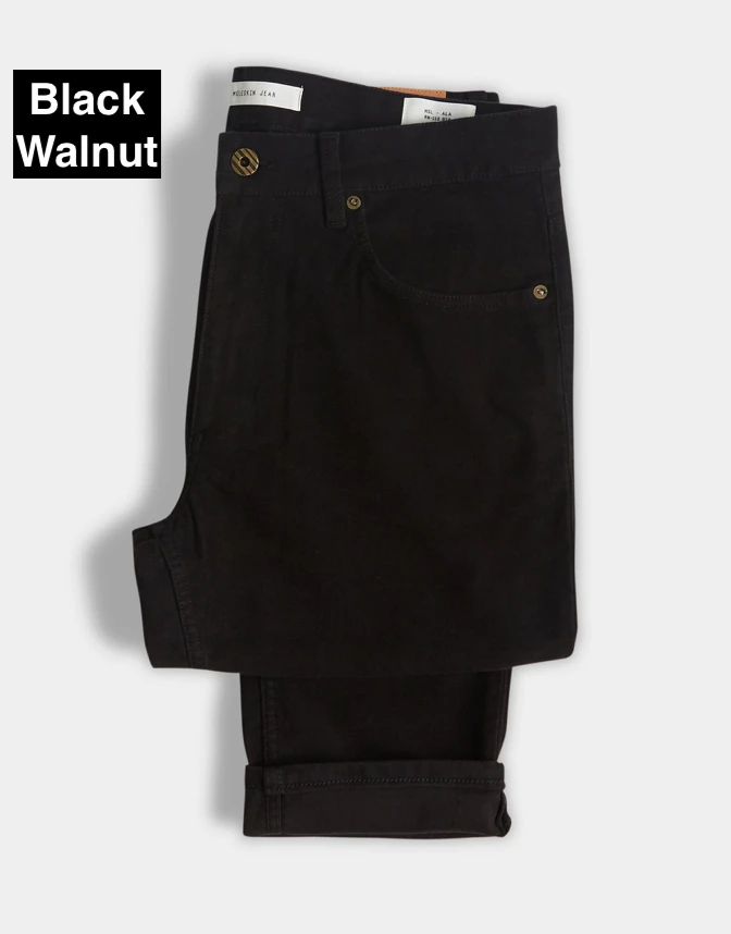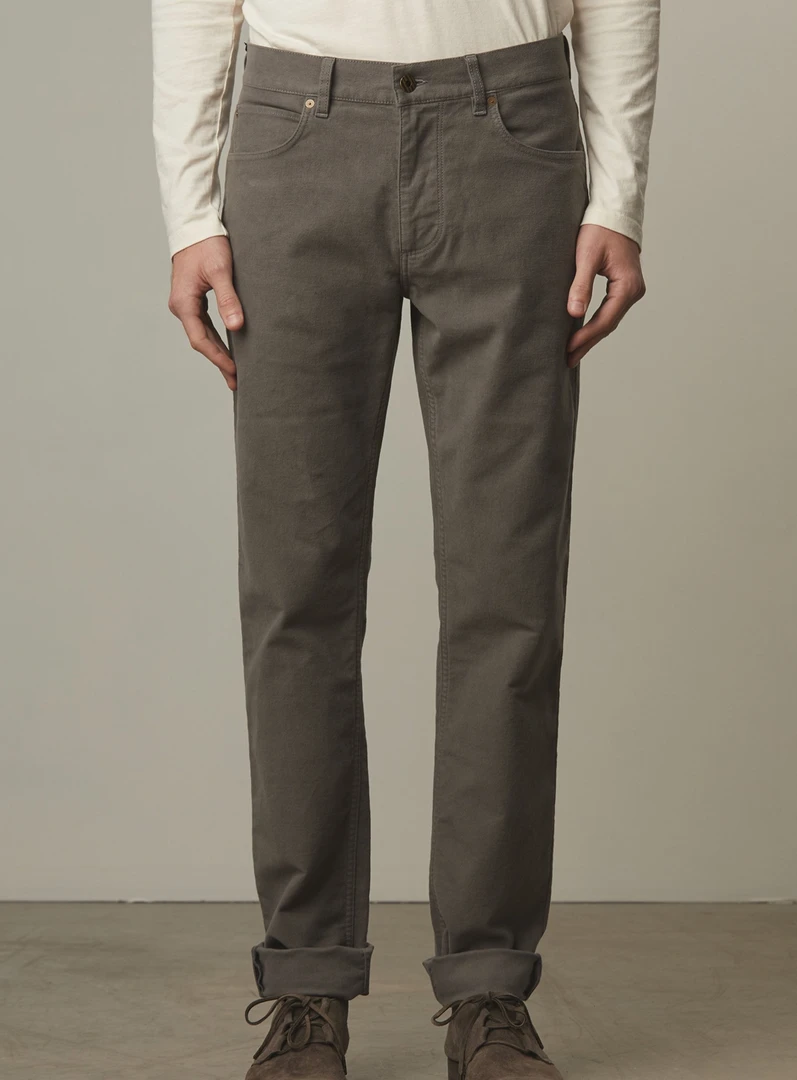 slim fit moleskin jeans are made with a hint of stretch for added comfort, and finished with luxe details like an antique brass button at the front center, and a vegetable-tanned leather patch at the waist.