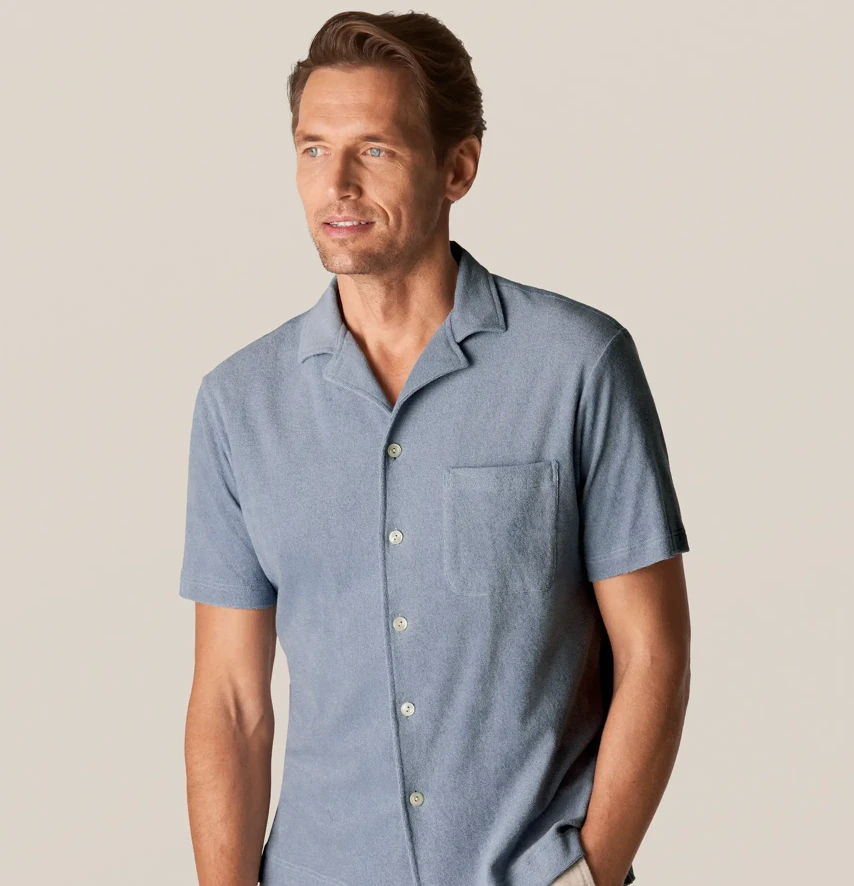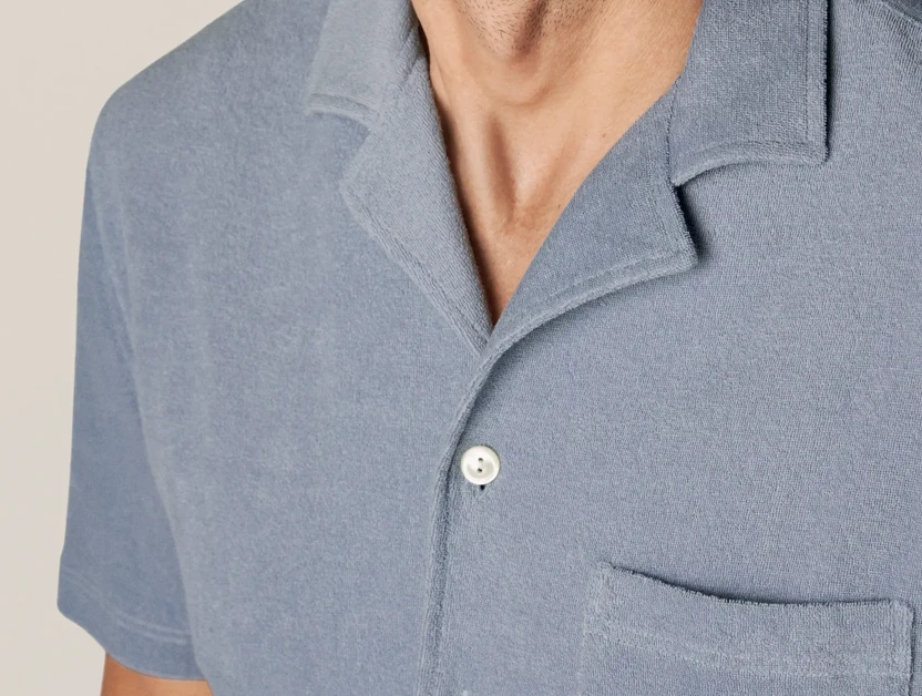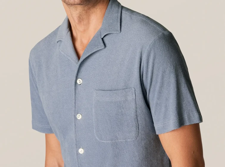 A retro-inspired, front-buttoned resort shirt in soft, comfortable Italian cotton Terry. As smart off the beach as on it – with a 60s inspired air.